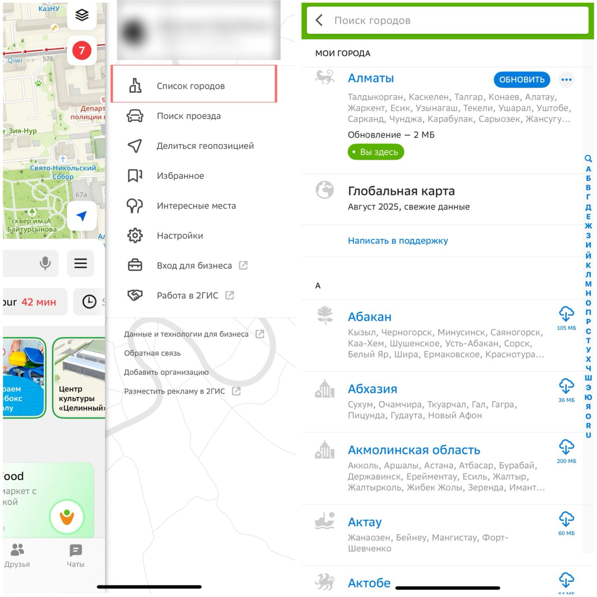 Также можно воспользоваться боковым меню приложения: выберите "Список городов" и скачайте необходимую карту.
