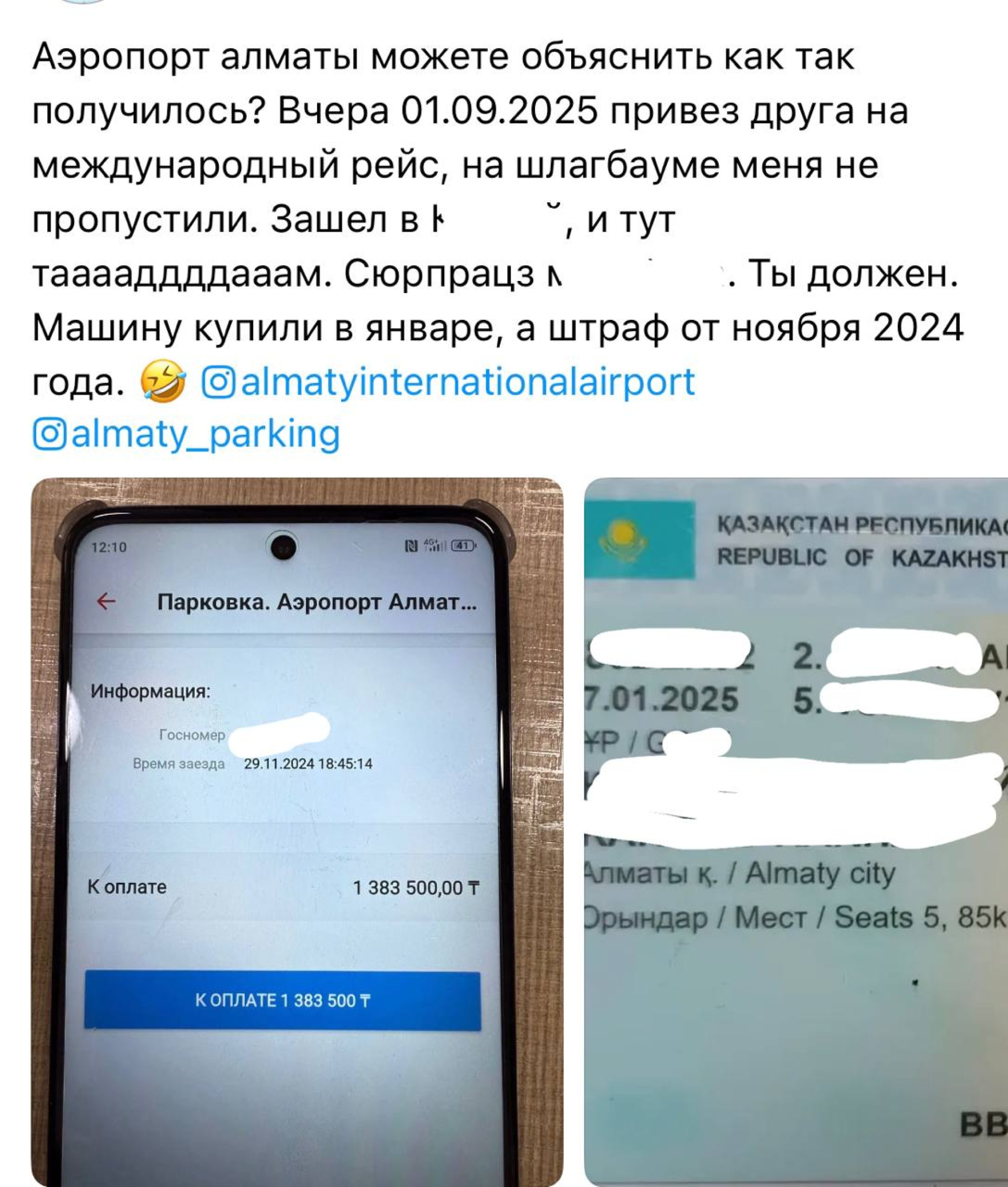 История произошла 1 сентября, когда мужчина привёз друга на международный рейс. При въезде к терминалу шлагбаум не открылся, и после проверки через банковское приложение он увидел уведомление о задолженности в размере 1 383 500 тенге. При этом автомобиль был приобретён им в январе 2025 года, тогда как штраф в системе был зафиксирован за ноябрь 2024 года. Он написал: "Аэропорт Алматы, можете объяснить, как так получилось? Машину купили в январе, а штраф от ноября 2024 года".