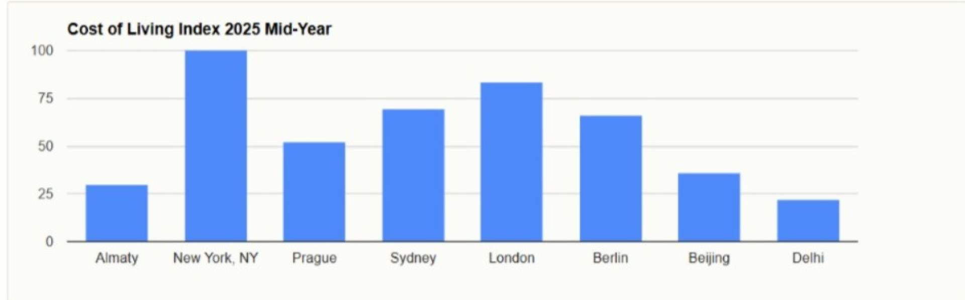 Индекс стоимости жизни в Алматы составляет 29,4 пункта, что выводит город на 346-е место в мировом списке. Астана с индексом 26,5 находится на 366-й позиции. Для сравнения, Бишкек занимает 364-е место с индексом 26,8, а Ташкент — 370-е с 26,2. Города Таджикистана и Туркменистана в рейтинге отсутствуют.