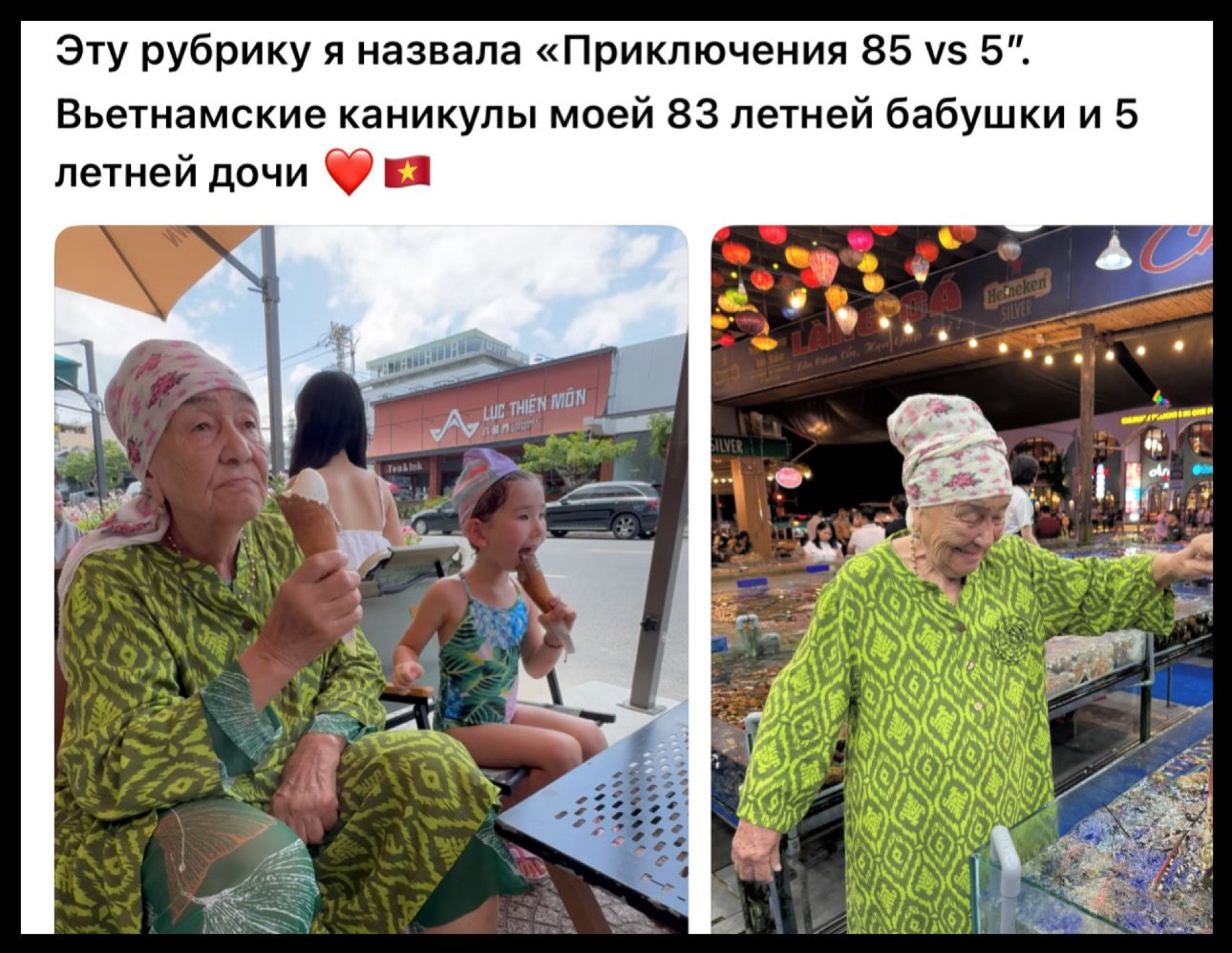 Поездка в Дананг стала замечательным приключением для нескольких поколений семьи. Сания назвала свою рубрику "Приключения 83 vs 5", показывая, как бабушка и её 5-летняя правнучка наслаждаются временем вместе.