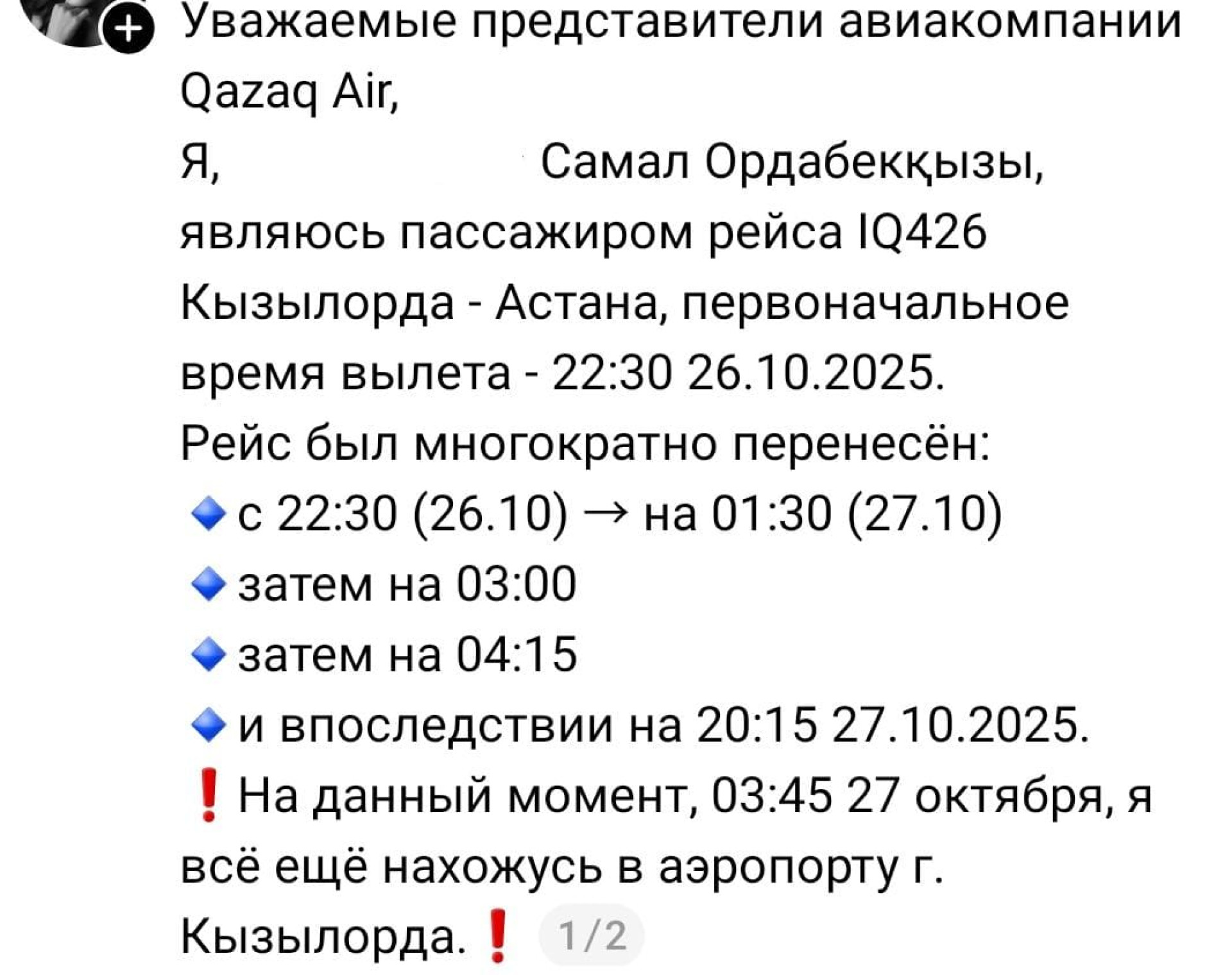 Казахстанка столкнулась с проблемами при вылете из Кызылорды в Астану. Она сообщила, что рейс IQ426, запланированный на 22:30 26 октября, неоднократно переносился.