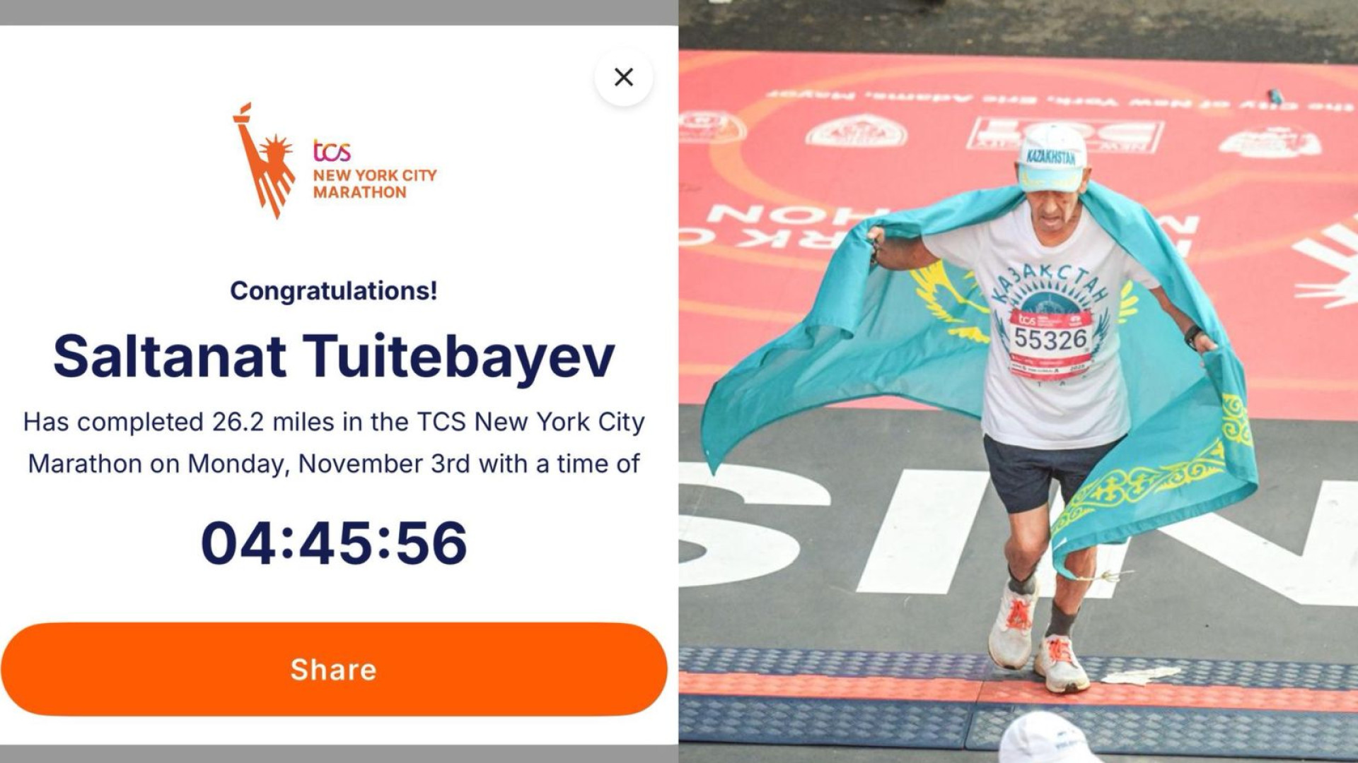 В этом году Нью-Йоркский марафон стал знаковым событием для Казахстана, благодаря 80-летнему пенсионеру Салтанату Туйтебаеву из Жамбылской области. Он продемонстрировал выдающийся результат, пробежав 42,2 километра за 4 часа 45 минут 56 секунд и заняв второе место в возрастной категории 80–85 лет.
