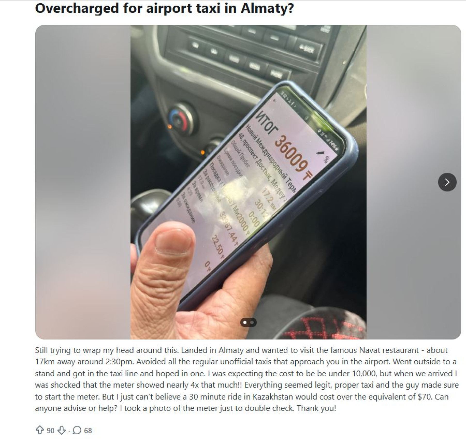 Несмотря на то, что Казахстан не попал в топ-15, на Reddit можно встретить истории о неприятных ситуациях с таксистами. Один из путешественников поделился, что был шокирован ценой поездки из аэропорта Алматы до ресторана. Он ожидал увидеть стоимость менее 10 000 тенге, но счётчик показал почти в четыре раза больше.