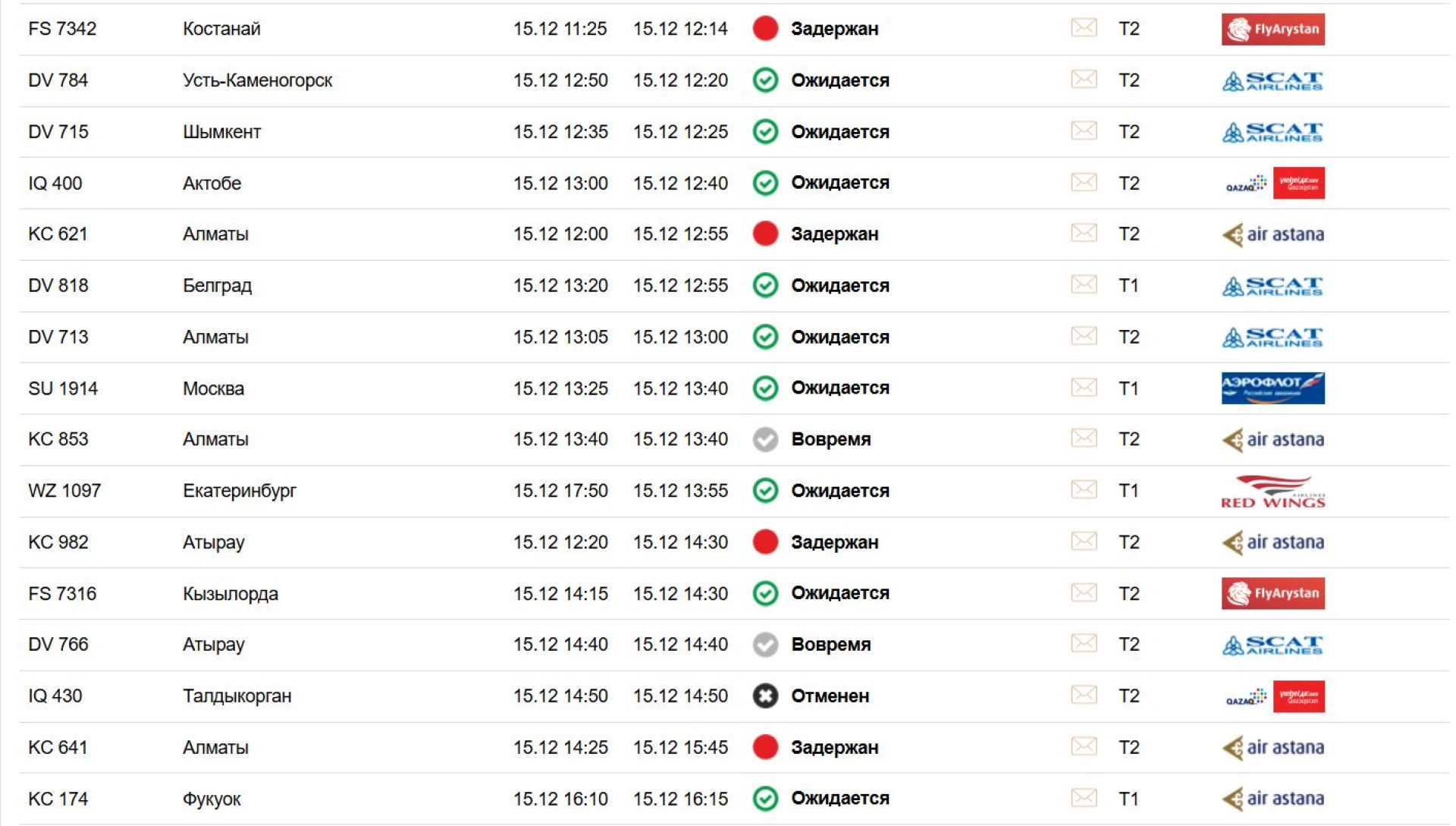 - Air Astana, KC 621 (Алматы) — задержка 55 минут;