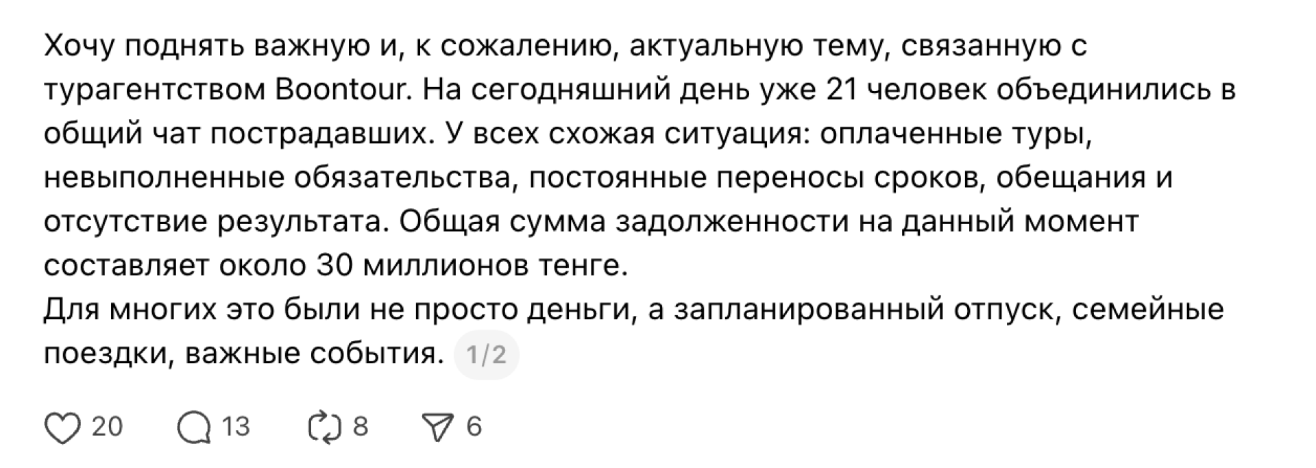 Скандал разразился вокруг туристической компании Boontour, когда десятки казахстанцев заявили о мошенничестве на сумму около 30 миллионов тенге. По словам пострадавших, вместо обещанного отдыха в Южной Корее и на Филиппинах они столкнулись с пустыми обещаниями.