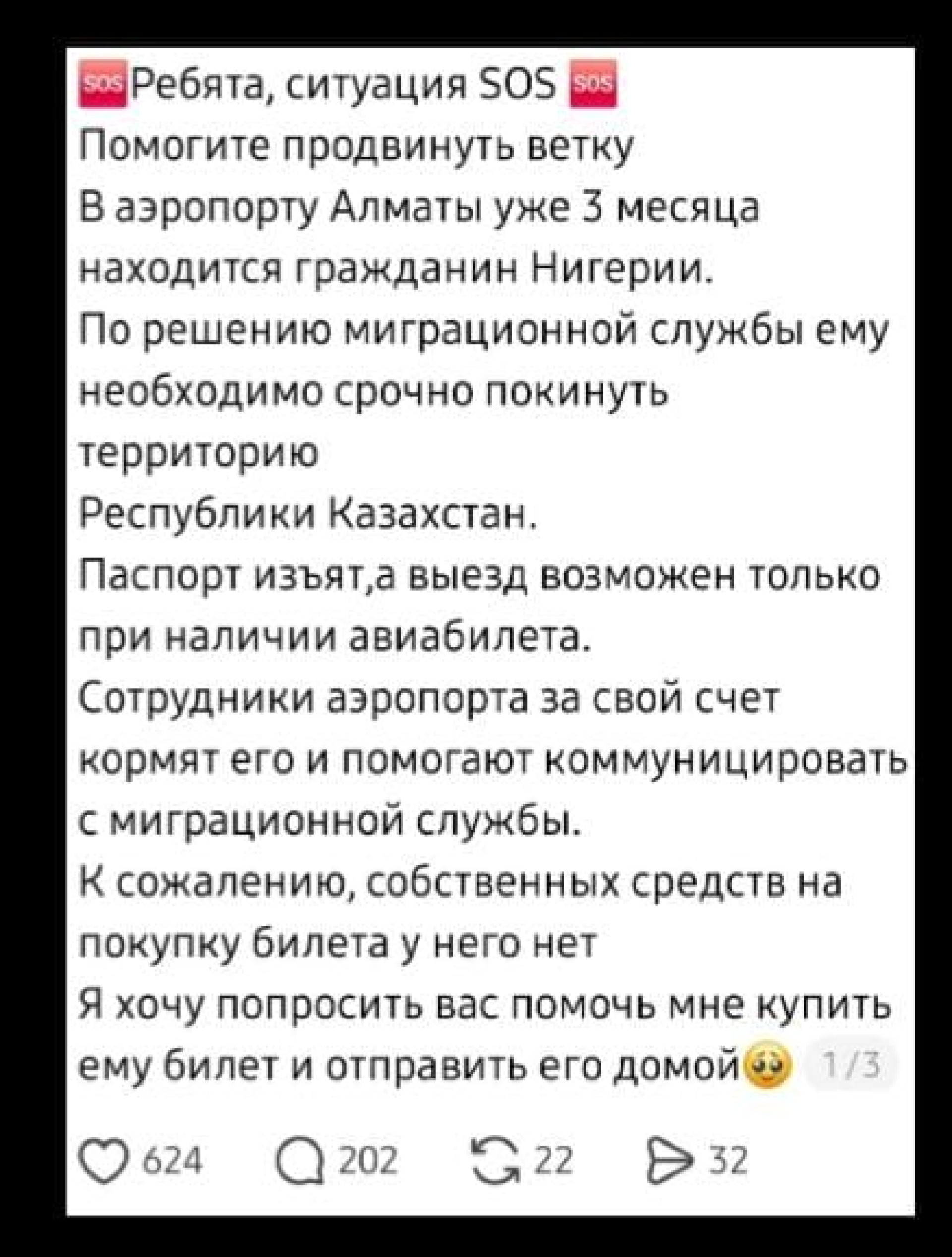 В соцсети Threads появилась удивительная история о гражданине Нигерии, который, по словам очевидцев, провёл около трёх месяцев в аэропорту Алматы, не имея возможности покинуть страну. Пользовательница Threads, представившаяся основателем благотворительного фонда, поделилась подробностями происшествия.