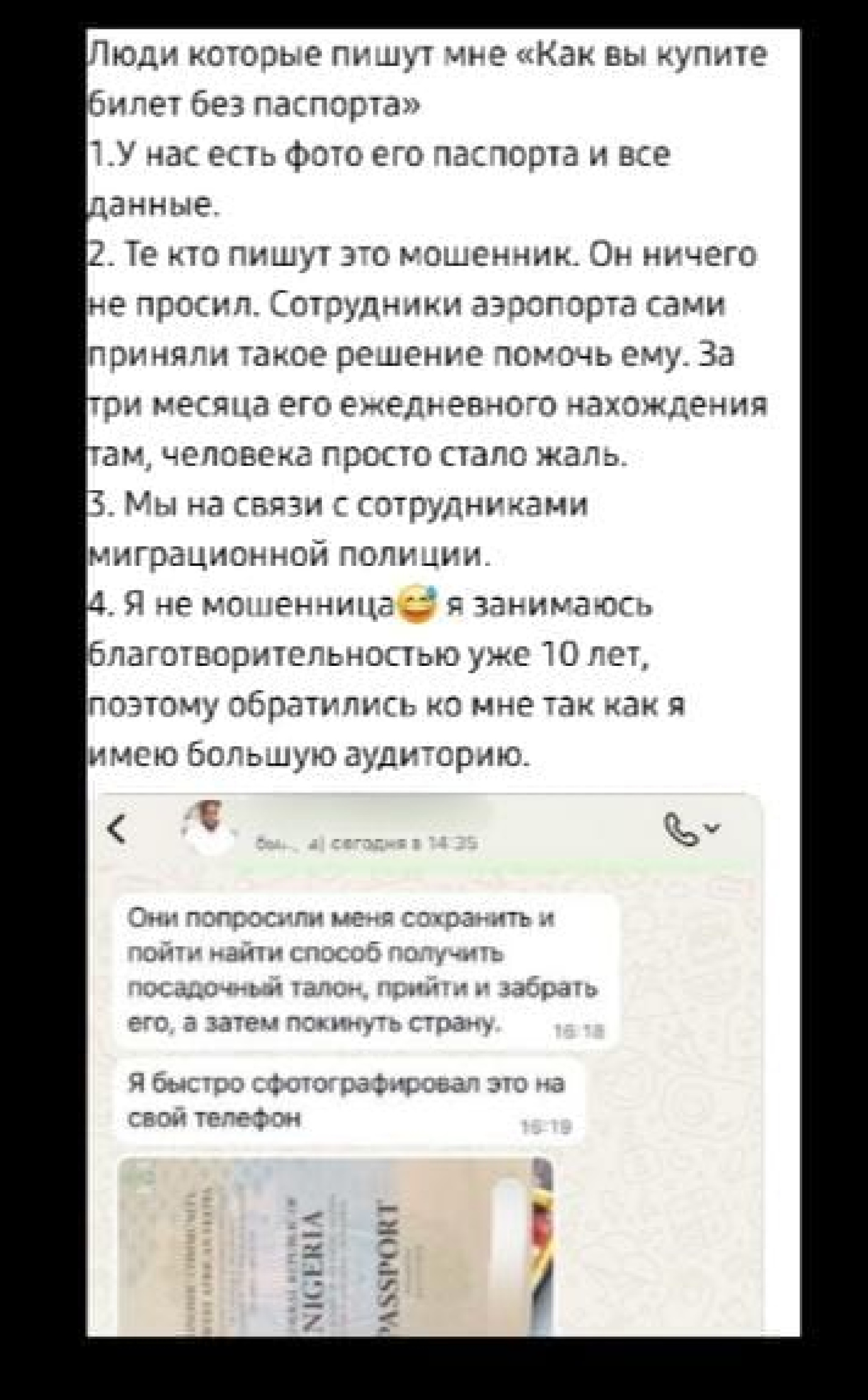 Автор публикации уточнила, что у неё есть фотография паспорта и все необходимые данные. По ее словам, мужчина сам не обращался за помощью, и инициатива исходила от работников аэропорта.