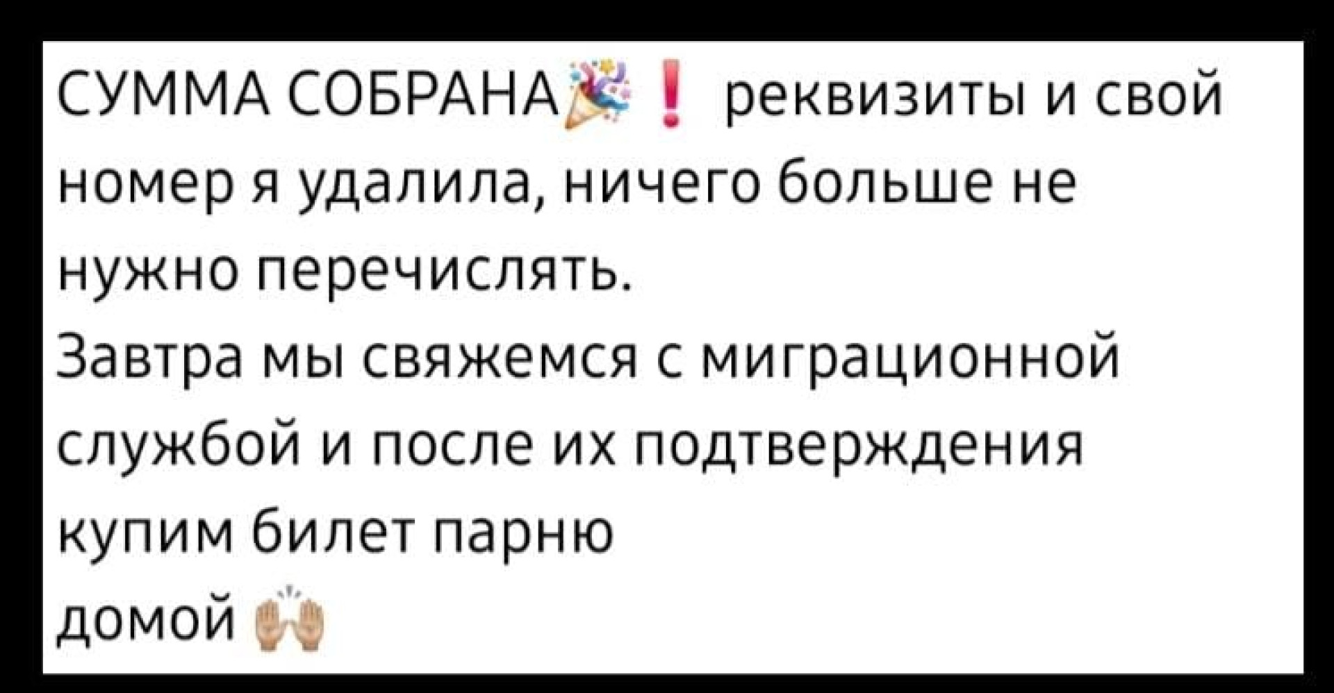 По ее словам, мужчина должен был вылететь из Казахстана по решению миграционной службы, но столкнулся с серьезными проблемами. Его паспорт был изъят, а вылет оказался невозможным без авиабилета, на который у него не хватало средств.