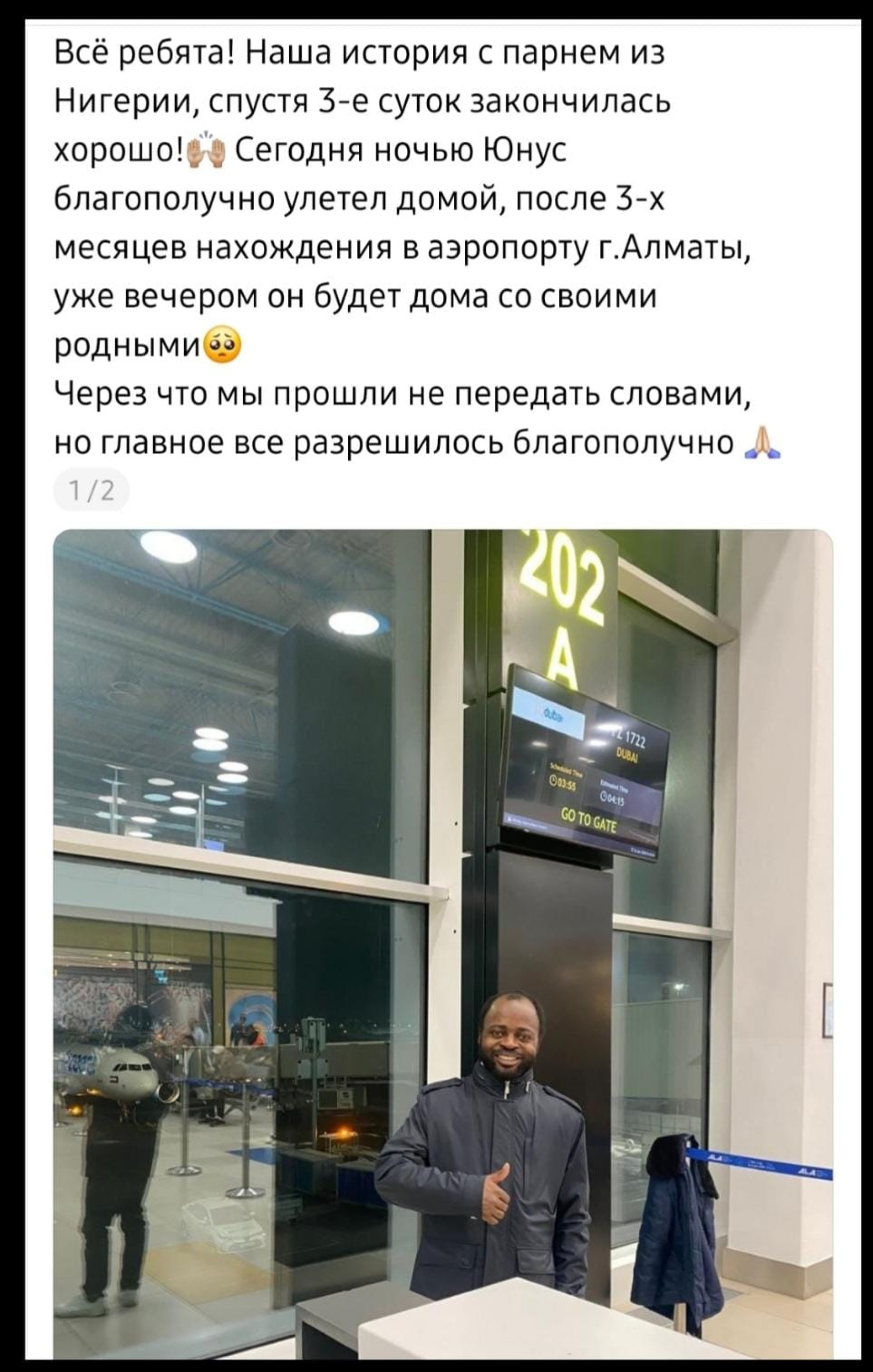 "История с парнем из Нигерии закончилась хорошо. Он улетел домой после трёх месяцев в аэропорту Алматы. Теперь он снова со своими родными", — написала она.