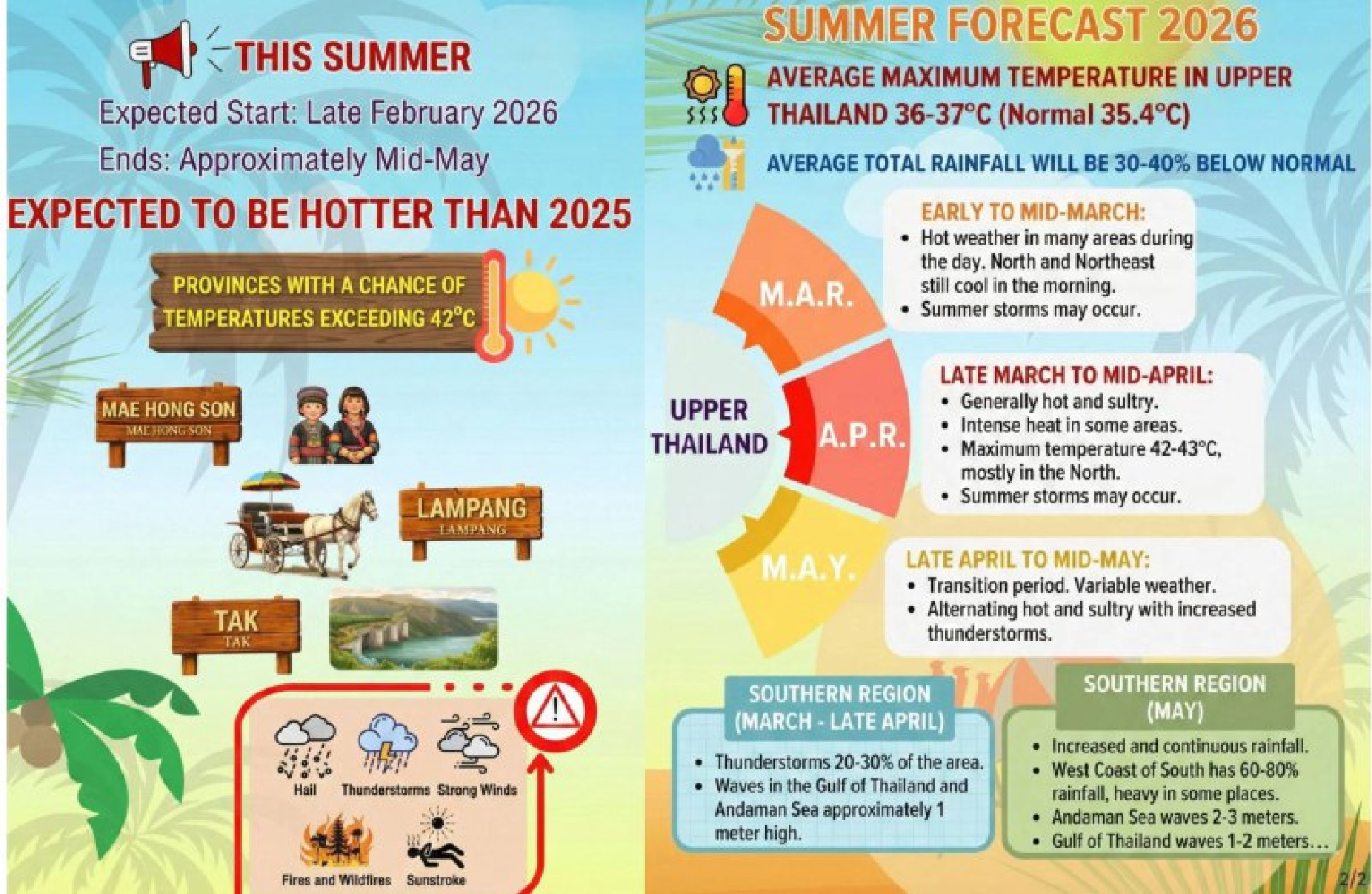 По прогнозам, температура воздуха в некоторых регионах может достигнуть экстремальных значений, особенно в период с конца марта по середину апреля. Наибольшая жара ожидается в северных провинциях, таких как Мае Хонг Сон, Лампанг и Так, где днём термометры могут показывать 42–43°C. Утром воздух остаётся относительно прохладным, но днём жара станет ощутимой.
