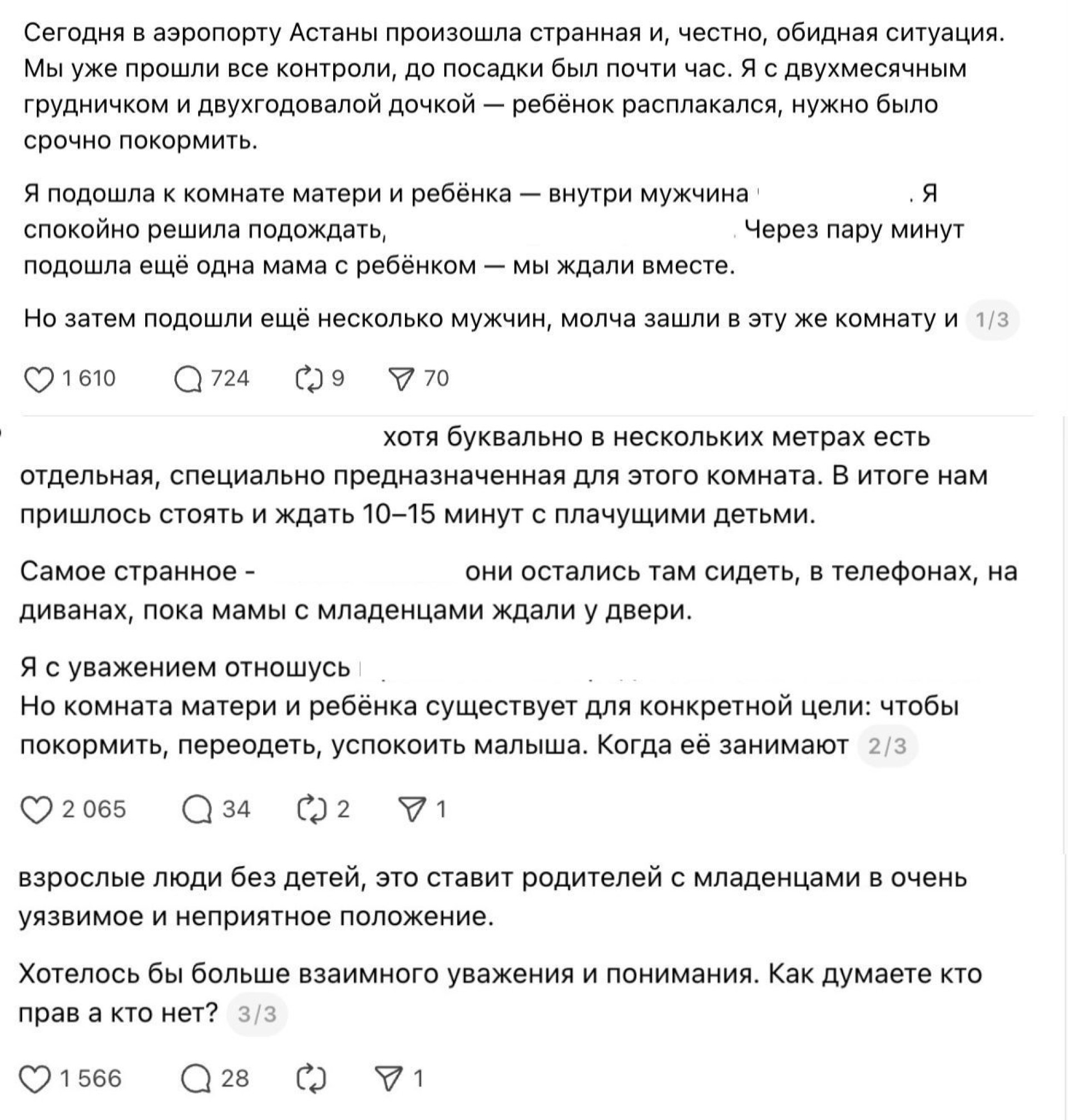 В аэропорту Астаны произошел спор, связанный с использованием комнаты для матерей и детей. Женщина с двумя детьми, включая двухмесячного младенца, не смогла воспользоваться этой комнатой перед вылетом из-за присутствия в ней мужчины без ребенка.