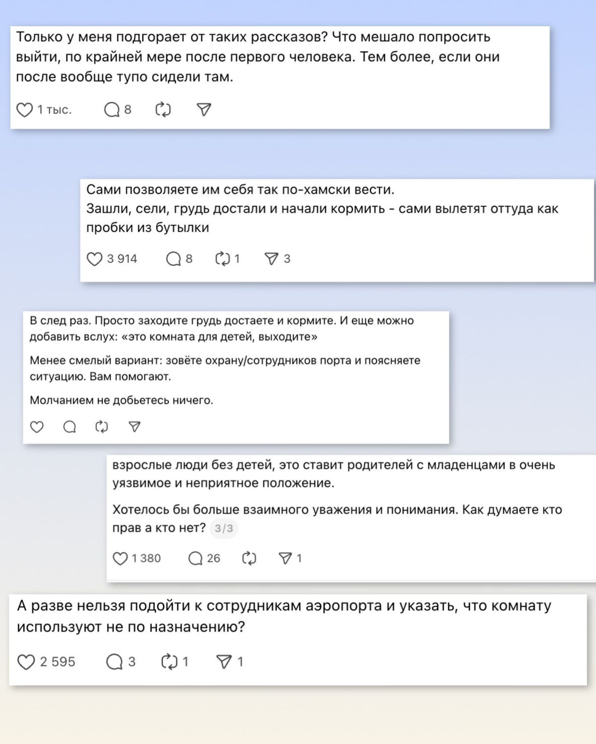 Согласно информации, сотрудники аэропорта должны быстро реагировать на такие обращения и принимать меры для освобождения комнаты для родителей с детьми.