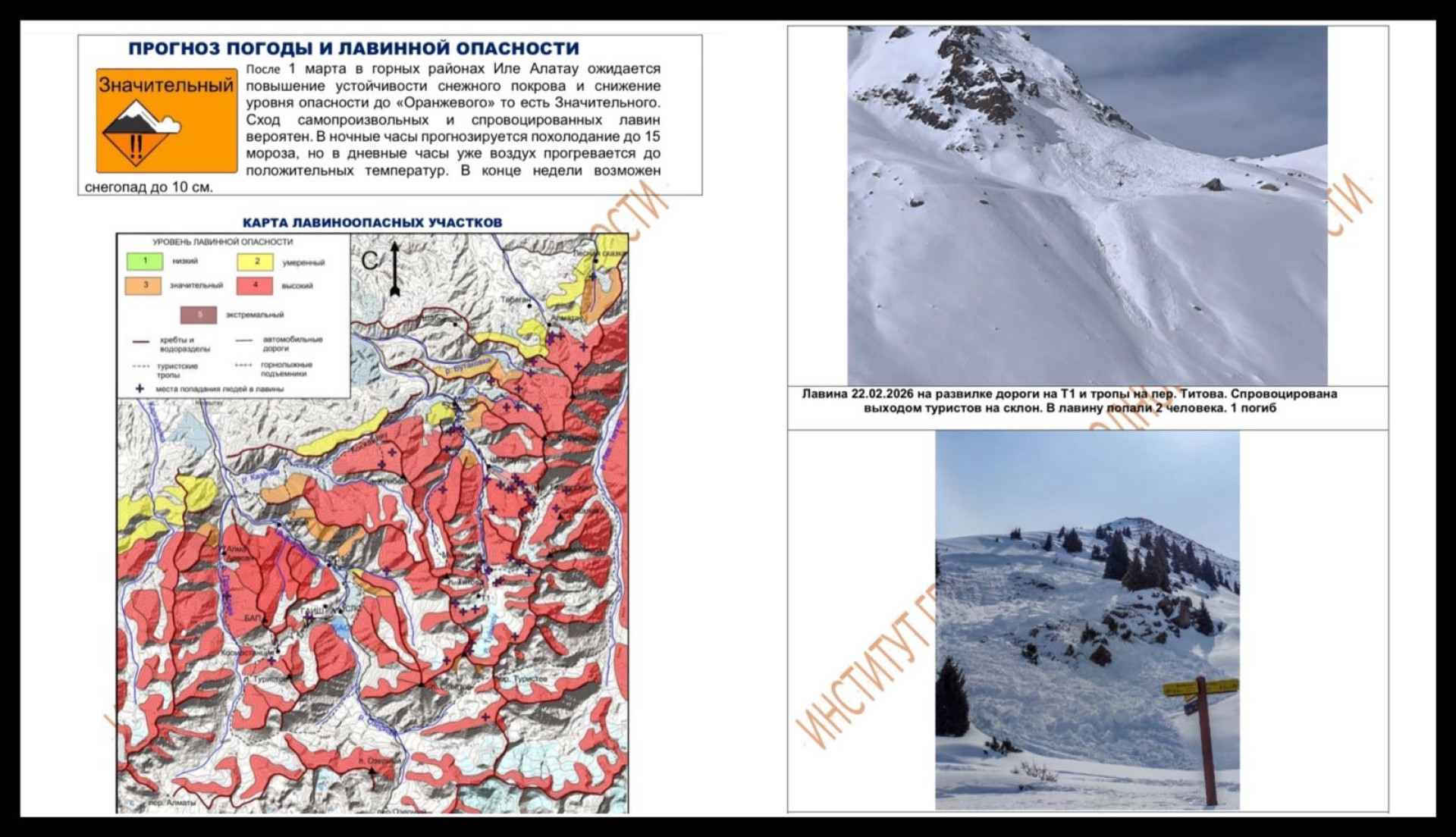 22 февраля на внетрассовой территории Сухого Лога лавина накрыла туриста. Его извлекли спасатели курорта Шымбулак и оказали первую помощь. Сейчас его жизни ничего не угрожает. В тот же день на перевале Титова под лавину попала группа из четырех человек. Двое туристов оказались под снегом: одному удалось выбраться самостоятельно, а второго засыпало полностью, и спасти его не удалось.